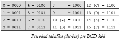 Reprezentácia čísel v dvojkovo-desiatkovom BCD kóde (Binary Code Decimal).